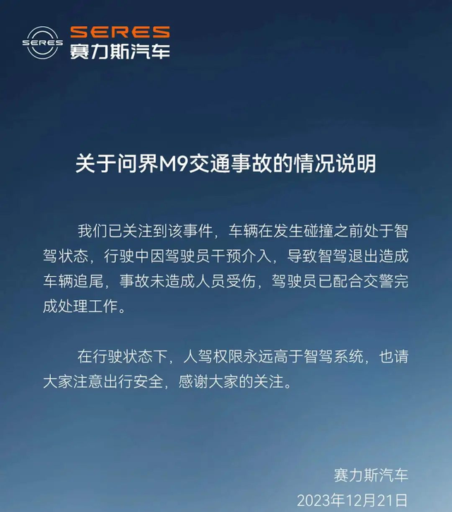 赛力斯官方对这一事件进行了回应,表示在事故发生前,车辆处于智能驾驶状态。然而,由于驾驶员介入导致智能驾驶系统退出,从而导致了追尾事故的发生。