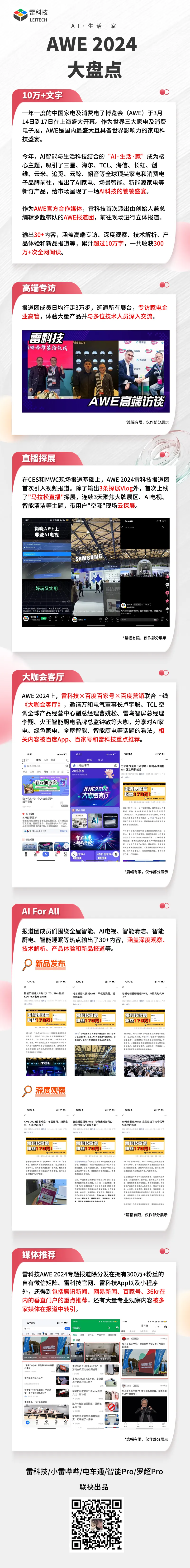 AWE 2024 系列专题 新品发布1、长虹壁画电视发布!首创六面纯平概念,AI功能加持2、海信发布行业最强中文大模型:AI开始改变电视了3、创维点歪科技树!电视新品狂卷音质,为何不走寻常路?| AWE新品4、TCL冰洗黑科技亮相AWE,硬核实力相当吸睛!5、智能门锁进入AI时代!TCL 3D人脸锁K9G Plus发布 | AWE6、老板电器重磅亮相AWE,AI厨具时代来了?7、海尔机器人亮相AWE!不仅能浇花,还能晾衣服深度观察1、AWE 2024首日观察:单品已死、场景永生,AI家电起风了2、AI电视,一夜爆发!3、AWE全屋智能火了!华为、TCL、云米、三翼鸟争奇斗艳4、厨电巨头的AWE关键词:AI、套系、健康、嵌入和绿色5、智能清洁卷疯了!六大趋势,不只是AI | AWE观察6、率先合二为一!在三翼鸟AWE看清家电、家居一体化新走向7、AWE 2024黑科技盘点:巨头各显神通,最大惊喜居然是它8、国产这一波,马斯克要跪了!9、智能睡眠狂卷AWE:智能床成新风口,但价格让人“高攀不起”10、显示技术狂卷AWE:MicroLED战未来,OLED制霸江湖