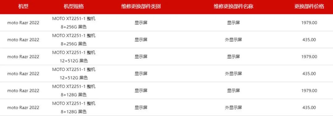 以上面提到的手机位列。一台motorazr 2022 8GB+256GB售价3000元出头,可内屏一旦损失,单独更换的价格为1979元人民币,算上人工费直接超过了2000元。而小米MIX Fold 2 12GB+256GB虽然只需5500元即可入手,但内屏的维修价格仍然高达4139元。因此,在很多社区上,不少用户都在抱怨折叠屏手机维修价格昂贵的问题。