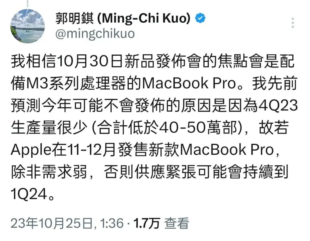 天风国际分析师郭明錤预计,这次的惊喜,是全新M3系列处理器,和新款MacBook Pro。
